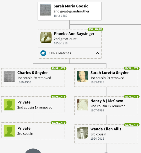Here is one daughter, and Ancestry correctly notes EVALUATE because she is the child of EH Baysinger's first wife, Margaret Jones. Many trees list her as Sarah Maria Goosic's daughter, in spite of the evidence. Just because it is presented, does not make it fact!