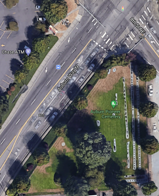 If you are north bound on Auburn Way North, a main thoroughfare in Auburn, south King County, Washington, and stop for a traffic light, you may glimpse a small cemetery to your right at 8th Street NE. This is the Auburn Pioneer Cemetery, on land donated for that purpose in 1878.